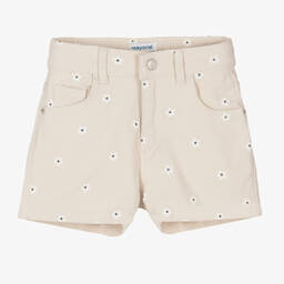 Girls beige daisy print shorts by Mayoral are made from soft, sustainable cotton twill. These cute and casual shorts feature a classic five-pocket design with glittery centres on the daisy prints for added sparkle. Branded on the back, they have an adjustable waistband with a popper and zip fastening for a secure and comfortable fit. Limited quantities available, so it's your last chance to buy!