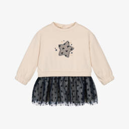 This ivory dress for little girls by Mayoral, combines comfort with a touch of elegance. The soft cotton-blend jersey top has gathered long sleeves and a charming star motif on the front embellished with navy blue bows and glittery gold dots. There is a delicate navy blue tulle skirt, with coordinating bow embroidery and a soft jersey lining.