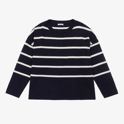 Beige viscose-blend sweater for girls by Spanish brand Mayoral, with bold black horizontal stripes. Super soft, it has a ribbed neckline and deep vents on the side seams for a comfortable fit. The hemline is longer around the back than the front, giving a casual look.