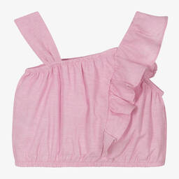Lovely for warmer days, a pretty blue linen cotton blouse for girls by Mayoral. Made in a softly woven blend, this stylish asymmetric top features a wide shoulder strap on one side and a pretty ruffle on the other, extending down the front and back. A comfortable, slip-on sleeveless style, it has elasticated trim and is designed to sit neatly on the waist. Last chance to buy, limited quantities available.