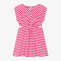 Girls blue striped cotton dress by Mayoral, crafted from soft and comfortable cotton jersey. Featuring contrasting chevron stripes on the bodice and an elasticated waistband with stylish cut-out detail, this dress is perfect for casual wear. The seamless short sleeves with turn-up trims and a keyhole button fastening on the back add practical charm. Limited quantities available, so don't miss your last chance to buy this chic and versatile dress.