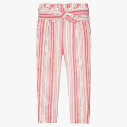 Blue, beige and white striped trousers for girls by Mayoral. They are made in a lightweight linen blend with a gold lurex weave for a touch of sparkle. They have a ruffled waistband which is elasticated on the back and can be easily adjusted for a comfortable fit and feel. Designed with a fixed bow on the front, they have practical pockets on the hips for carrying small valuables.