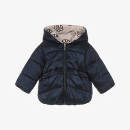A champagne gold and beige reversible hooded jacket for girls from Mayoral, made in silky and lightweight fabric. One side is plain gold with a lovely shimmer, and the reverse is beige with a sweet black daisy print. The jacket has handy side pockets, frilled details and an easy-to-fasten front zip.