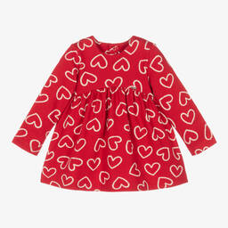 Green dress for younger girls by Mayoral, knitted in super soft cotton with a fleecy inside for cosy comfort. Knitted within the fabric are white and navy blue flowers for a sweet look. Easy to fasten, there are poppers on the back to help make dressing simple.