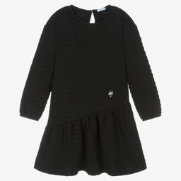 A grey-marl dress for older girls by Mayoral. It is made in stretchy, mid-weight jersey, with a raised snake-effect pattern and a silver-tone 'Girl Power' metal detail stitched on the front for a cool, edgy look. It has a dropped waist in an asymmetric shape and a keyhole button fastening on the back to complete the design.