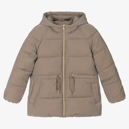 Girls hooded black puffer jacket by Mayoral offers a blend of style and warmth. Crafted from silky soft fabric, this jacket features mid-weight padding and a cosy polar fleece lining, providing comfort during chilly days. Gold-tone hardware and a drawstring waist add a touch of elegance, while front pockets provide practicality. Suitable for cold-weather adventures, this jacket is available in limited quantities, making it a last chance to buy this season.