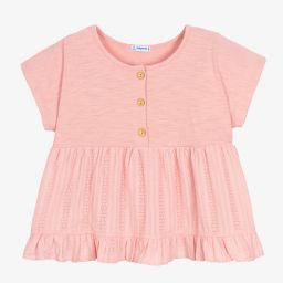 Girls ivory tunic-style T-shirt from Mayoral, made in soft slub cotton jersey. In a loose-fitting style, it has a gathered waist and a ruffle hemline. There are beige button fastenings on the front and the lower half has a pretty woven pattern.