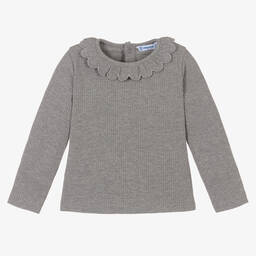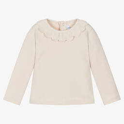 Ivory ribbed cotton-blend top for little girls by Spanish brand Mayoral, made in comfortable, stretchy jersey. It has a sweet scalloped ruffle around the neckline and concealed popper fastenings on the back to make dressing quick and easy.