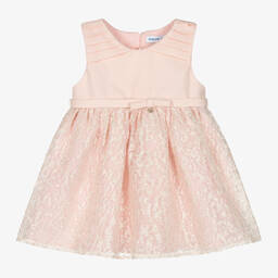 Lovely ivory sleeveless dress for little girls, by Mayoral. Woven in a soft linen blend, it has smart pleats on the shoulders and a bow sash belt with a cute gold heart logo charm. Lined in soft cotton for comfort and volume, the skirt has a gorgeous organza overlay with a crushed velvet sheen. It has a stylish cut-out on the back and fastens with a concealed zip and simple buttons.