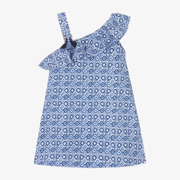 Girls orange patterned dress by Mayoral, featuring a charming geometric design on a white background. Made from soft, lightweight jersey, it is cool and comfortable, with an asymmetric frill around the bodice and a fixed wood-effect ring with tassels on the shoulder strap. Easy to wear, it simply pulls on over the head. Limited quantities available.