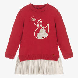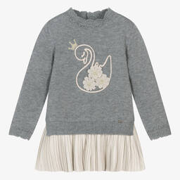 Pink and beige dress for little girls by Mayoral, knitted in a soft viscose blend. The sweater-style top has a lovely swan motif on the front, trimmed with 3D flowers and sparkly gold embroidery. It has a sweet scalloped neckline and matching trims on the cuffs. For a contrasting look, the sparkly beige skirt is pleated for a girly style. This pretty dress fastens with simple buttons on the back of the neck.