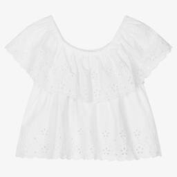 Beautiful pink blouse for girls by Spanish brand Mayoral, made in soft sustainable cotton jersey. Lightweight and flowy, it has pretty broderie anglaise detailing, a ruffle trimmed bodice and an elasticated neckline for a flattering, off-the-shoulder style.