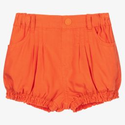 Cute pink bubble shorts for little girls by Mayoral, made in super comfortable, sustainable Tencel™ Lyocell. They have pleated detailing and pockets on the front, with shirred leg cuffs. Styled with a decorative logo button, the waistband is gently elasticated and adjustable.