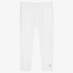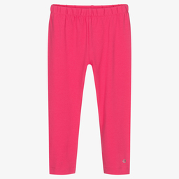 Cropped coral pink leggings for girls by Mayoral. Made in comfortable sustainable cotton jersey, they have an elasticated waistband and a shiny silver cloud logo printed on one leg.