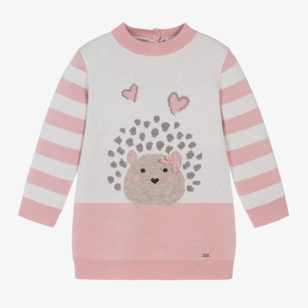 Girls pink cosy knit dress by Mayoral offers a delightful blend of warmth and charm for the autumn and winter months. Crafted in a soft viscose blend, it features an adorable hedgehog design with embroidered details and charming bow appliqués. The back button fastening provides a neat fit, making it easy to wear. With its playful design, this dress is great for keeping little ones snug during cooler days. Limited quantities available, so don't miss out.