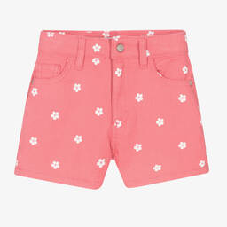 Casual pink shorts for girls by Mayoral, made in soft and stretchy cotton jersey. A sporty cycling style, they have an elasticated waistband to ensure a comfortable fit and feel. The brand's metallic silver logo is printed on one leg for a subtle branded touch.