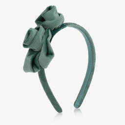 Pretty pink hairband for little girls by Mayoral. The narrow flexible band is covered in soft velvet with matching velvet flowers on the side.