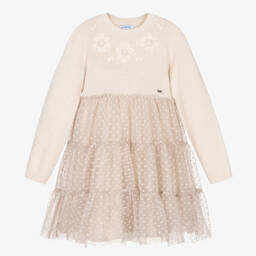 Lovely pink dress for girls by Mayoral. The bodice is made in a soft chunky knit with a sparkling gold thread running through. Warm and cosy it has pretty floral knit detailing on the chest and a gold metal charm on the waist. For a touch of elegance, the skirt is made in layers of soft and sparkling tulle, lined in a soft cotton jersey for comfort. This product contains recycled fibres.
