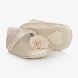 Adorable pearlised pink pre-walker shoes for baby girls, by Mayoral Newborn. Made in soft faux leather, they have a pretty pink tulle flower on the front, a sweet picot trim, and a velcro fastening strap across the front for easy dressing.