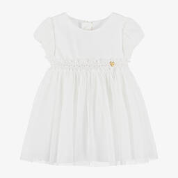 Girls pink spotted tulle dress by Mayoral is a lovely addition for special occasions. Crafted from a soft cotton blend, it features a round neckline, an ivory trim on the waistline, and a charming gold logo charm. The short sleeves, adorned with spotted tulle, complement the full skirt, while two layers of soft cotton lining ensure comfort. A concealed zip at the back makes dressing easy. Limited quantities available; don't miss out.