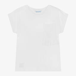 Girls red cotton T-shirt by Mayoral features a beautiful lace chest pocket and fringing detail, making it a stylish addition to any wardrobe. Crafted from soft, comfortable jersey with seamless short sleeves and turn-up cuffs, it is perfect for everyday wear. Limited quantities available, so don't miss this last chance to buy.