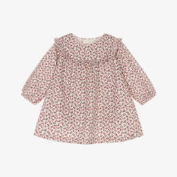 This charming red and white dress for little girls by Mayoral is made in soft cotton twill. Patterned with a lovely floral design, it features a sweet ruffle across the bodice and elasticated cuffs. Lined for comfort, it fastens neatly with buttons on the back.