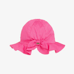 The turquoise blue sun hat for girls by Mayoral is crafted from lightweight cotton twill with a soft voile lining, ensuring comfort and breathability. This charming hat features a flippy brim adorned with a decorative bow and a subtle logo charm at the back. An elasticated panel is cleverly hidden to provide a secure fit, making it an ideal accessory for sunny days. Limited quantities available, so don’t miss the chance to add this delightful piece to a spring or summer wardrobe.
