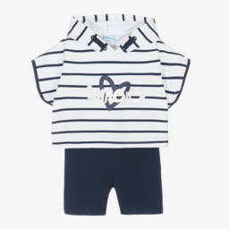 Lovely white and neon pink shorts set for girls, by Mayoral. Made in a soft cotton jersey blend, the cropped black striped hoodie has a neon pink drawstring, and a neon pink and sparkly silver heart print on the chest. It comes with neon pink jersey cycling shorts, with an elasticated waist for a comfortable fit.
