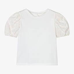 The girls yellow cotton floral T-shirt by Mayoral is a delightful addition to any wardrobe. Made from soft and stretchy cotton jersey, it features a lightly textured tonal floral print on the puffed short sleeves and across the top of the back. The stylish cut-out design on the back is partially elasticated for added comfort. Limited quantities available, so grab this charming piece while you can.