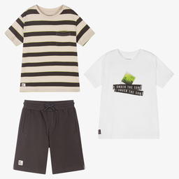 Three piece shorts set for boys by Mayoral Nukutavake, made in comfortable cotton jersey with a 'Made for Sunsets' tab on each piece. The white T-shirt has a photograph of surfers printed on the front with the words 'Under the Sun'. The khaki green, black and orange striped T-shirt has a chest pocket. The black shorts have a useful drawstring.