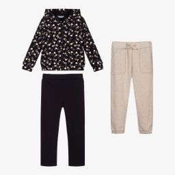 Three-piece tracksuit for girls by Mayoral, made in soft and stretchy cotton jersey. The light grey marl zip-up top is hooded and has an all-over heart print in black and white. There are two pairs of joggers, one is light grey marl and the other is dark grey marl. Both have comfortable elasticated waistbands, one with a faux drawstring.
