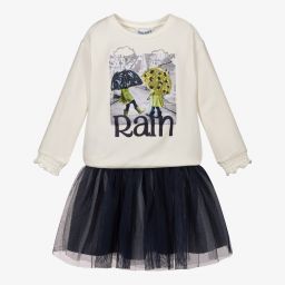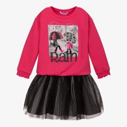 Charcoal grey top and pink tutu skirt set for girls by Mayoral. Made in soft cotton jersey, the grey top has elasticated sleeve cuffs and a cute pink and grey sequin rain print on the front. The pink tulle skirt has an elasticated waist and a lightweight lining.