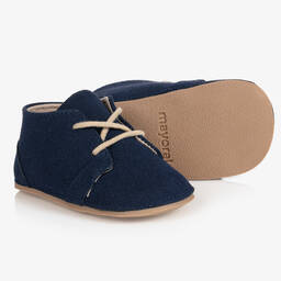 Grey faux suede pre-walker shoes for baby boys by Mayoral Newborn. They have a soft grey jersey lining, grey laces and a flexible non-slip rubber sole.