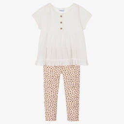 Ivory and green cotton leggings set for girls by Mayoral. The top is made in soft slub jersey with a decorative woven panel on the front and matching ruffle trim. It opens at the neck and has coconut button fastenings. The sage green leggings have a beige heart pattern and an elasticated waistband.