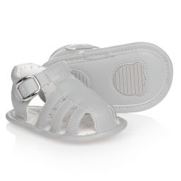 Navy blue pre-walker sandals for baby boys and girls by Mayoral Newborn. Made in soft faux leather, they have a dot-patterned cotton lining and rubberised pads on the soles. They fasten with a velcro strap which has a faux silver buckle.