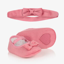 Adorable pale pink velvet pre-walker shoes and headband set for baby girls, by Mayoral Newborn. The shoes are flexible with rubberised pads on the soles to help little ones finding their feet. The headband has an elasticated strap for comfort.