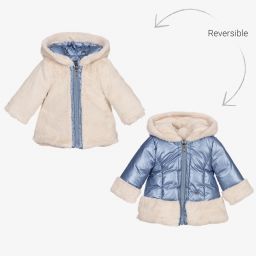 Reversible coat for younger girls by Mayoral, with a hood and cosy recycled padding. The silky pink side has a pretty sheen and super soft faux fur trims in beige, with a silver logo tab on one side. The beige side is in matching faux fur with concealed side pockets.