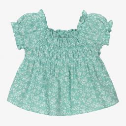 Pink floral cotton blouse for girls by Mayoral. Made in soft, lightweight seersucker, this pretty top has a delicate white floral print and a stretchy, ruched panel across the front, on the neckline and the sleeve cuffs.