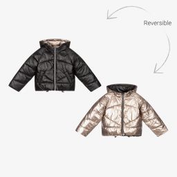 Reversible metallic puffer jacket for girls by Mayoral, made in recycled fibres. The pearly pink side has pockets on the front, whilst the silver side has concealed side pockets. There are drawstrings on the hood and hemline.