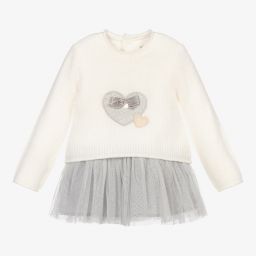Sweet beige and red dress for baby girls by Mayoral Newborn. The beige knitted overlay on the bodice is ribbed and sparkles with gold thread. It has ivory, red and green appliqué flowers and a knitted red bow on the front. The red tulle skirt is lined in lightweight cotton.