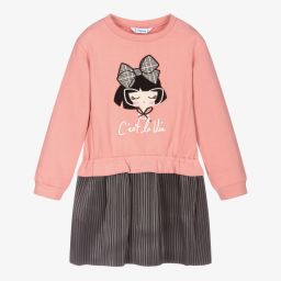 A fun red and black dress for girls by Mayoral. Made in soft sweatshirt jersey, the bodice a cute girl motif, embellished with tiny black studs. The skirt is pleated and has a faux leather look. The dress has a comfortable elasticated waistband.
