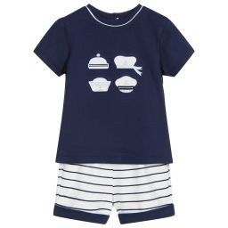 A cute nautical-themed shorts set for baby boys by Mayoral Newborn, made in soft cotton jersey. The navy blue and white striped shorts have turn ups and a comfortable elasticated waist. The red T-shirt has sailor hat appliqués on the front, with poppers on the back.