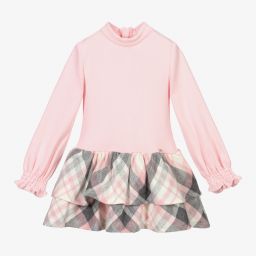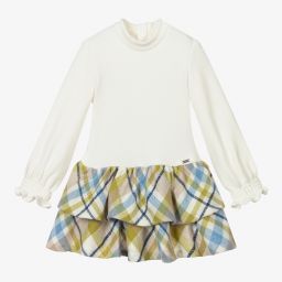 A lovely red, navy blue and ivory dress for little girls by Mayoral. The bodice is finely knitted and has a warm brushed inside. Lined in lightweight cotton, the checked skirt has a touch of silver sparkle. The dress has a concealed zip fastening on the back.