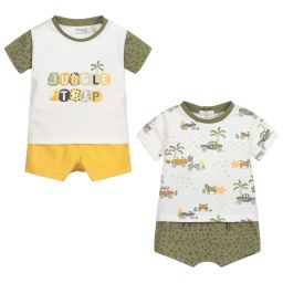Pack of two, cotton jersey shorts sets for baby boys by Mayoral Newborn. One of the white T-shirts has a red and blue safari jeep print, while the other has a 'Jungle Trip' print on the front, with blue leopard print sleeves. One pair of shorts is plain red, while the other has a blue leopard print.