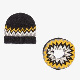 Teen boys can keep cosy and warming in this navy blue hat and snood set by Mayoral. Made in a super soft acrylic and wool blend, this matching set has a red, grey, navy blue and white zigzag pattern and finished with ribbed turn-ups for extra comfort.