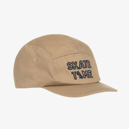 White cap for teen boys by Mayoral, made in sustainable cotton twill. It is embroidered with 'skate time' in navy blue, orange and green, incorporating a skateboard motif. For an adjustable fit, there is a velcro-fastening strap on the back.