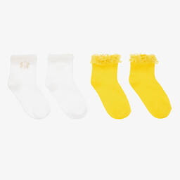 Two pairs of red and white organic cotton socks for teen girls from Mayoral. With feminine scalloped trims on the ankle, these stretchy knitted socks come in different designs. The white pair are detailed with lovely floral lace trims and the red pair have delicate white roses with gold glitter accents.