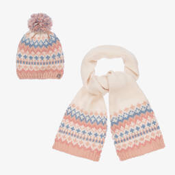 Yellow and pink hat and scarf set for teen girls by Mayoral. The beanie hat has a large fluffy pom-pom on top and a gold metal logo charm on the ribbed brim. The scarf has wide stripes of alternating colours and is long enough to wrap around the neck for extra comfort. This cosy set is knitted in a soft acrylic mix for added warmth.