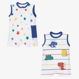 A pack of two white shorties for baby boys by Mayoral Newborn, made in soft cotton jersey. One shortie has blue stripes, trims and a cute bunny pocket on the front. It fastens with buttons on the back and poppers between the legs. The other has a blue and brown dinosaur 'run' print, with brown trims and popper fastenings on the back and between the legs.