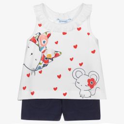 Little girls white sleeveless top and fuchsia pink shorts set by Mayoral, made in comfortable cotton jersey. The top is ruffled around the neck with an elasticated gather on the back, and brightly coloured toucan print. The pull-on shorts have two pockets on the front.